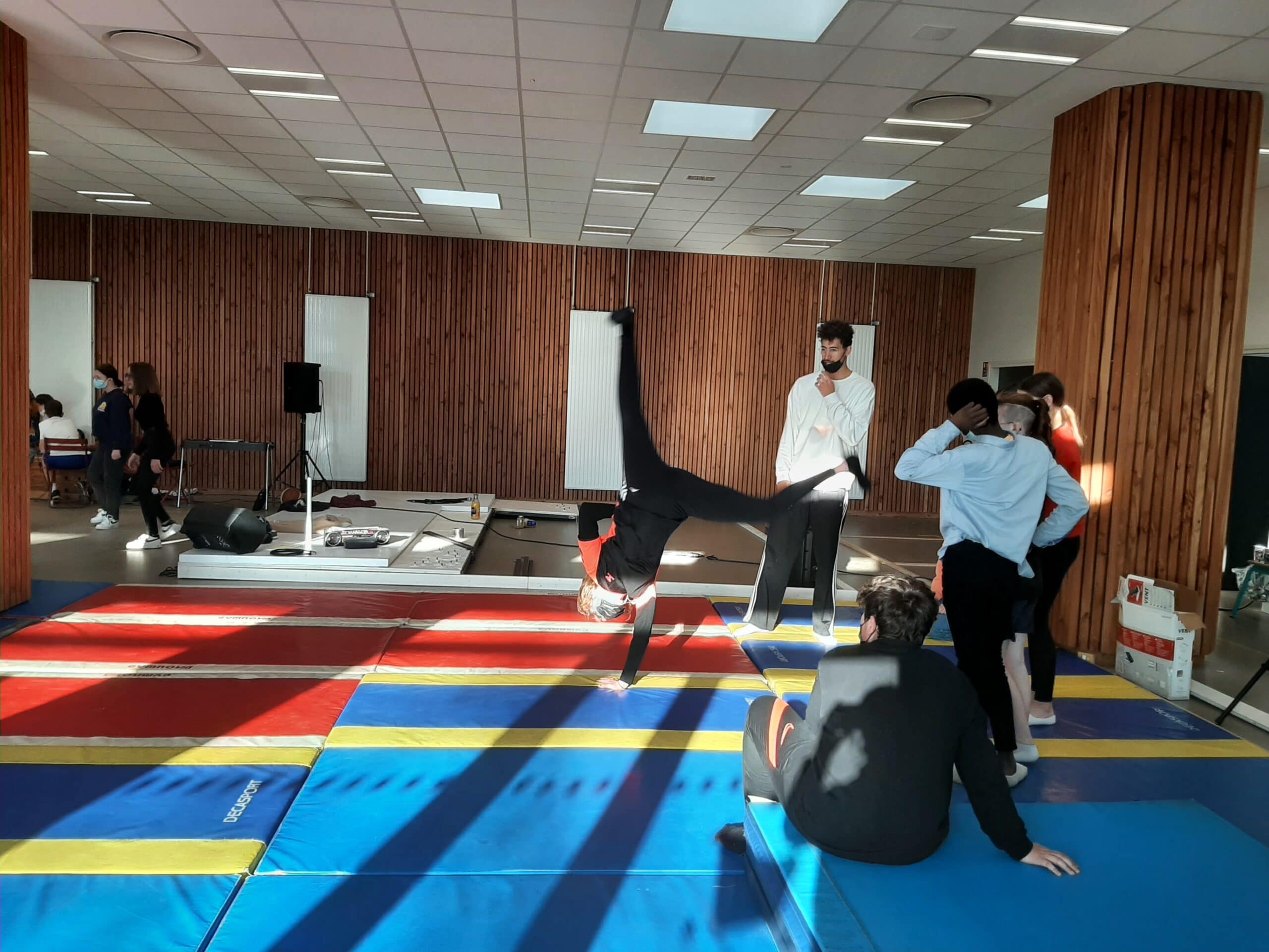 La deuxième semaine a ainsi été dédiée à la pratique artistique. Tous les matins, les deux classes commençaient par partager 1h de travail en commun : échauffements, jeux de cohésion et de concentration, travail corporel autour du rythme, les élèves ont pu traverser différents exercices du quotidien des artistes. Chaque classe bénéficiait ensuite de 3h de pratique artistique dans la journée. Les élèves ont d’abord testé différents ateliers afin de pouvoir s’essayer aux multiples matières proposées par la compagnie, avant de choisir une ou plusieurs disciplines à approfondir : danse, jonglage avec chapeau et musique avec Juri, jonglage avec balles et acrobatie avec Ricardo, les élèves ont ensuite développé leur apprentissage par le biais de l’univers artistique de la compagnie TBTF : comment créer un numéro de jonglage avec une seule balle, en intégrant de l’acrobatie et une rythmique ? Comment danser la house en jonglant avec des chapeaux ? À la frontière de différentes disciplines, l’univers riche, varié et métissé de la compagnie Too Busy To Funk a convaincu les élèves. Guidés par les artistes, ils ont pu découvrir par la pratique comment mêler ces différentes disciplines pour faire émerger une forme artistique originale, expérimentant par là même le processus de création. Très impliqués et volontaires, les élèves de 4ème se sont investis avec beaucoup d’enthousiasme et ont su progresser tout au long de la semaine, en appréhendant aussi les notions d’entraide et de persévérance nécessaires à la pratique du cirque.